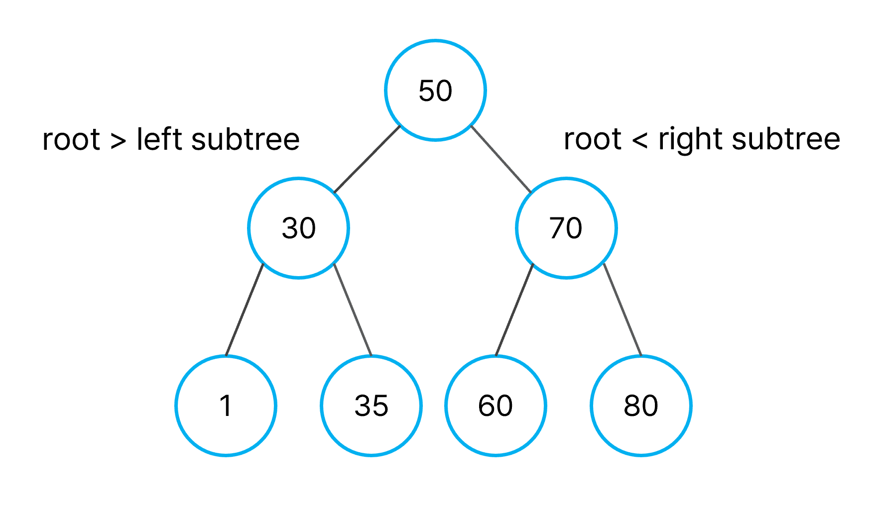 - 노드의 왼쪽 하위 트리에는 노드의 키보다 작은 키가 있는 노드만 포함된다.