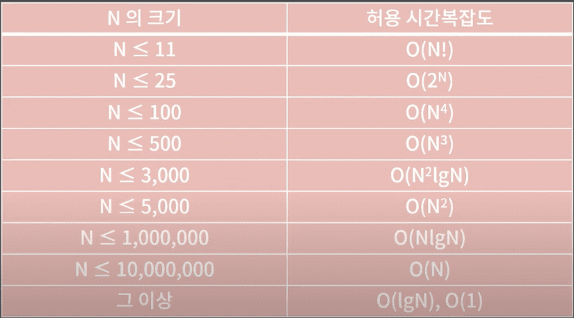 - O(N!) : 1부터 N까지 곱한 값 (N이 11이하정도로 작은게 아니면 시간 제한을 통과하기 어렵다)