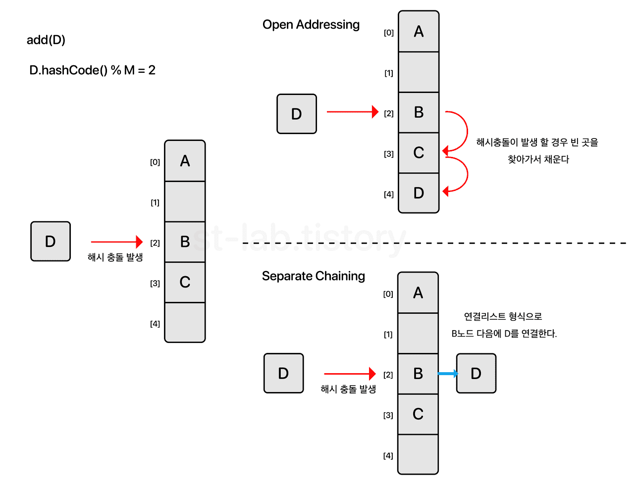 해시 함수로 얻은 주소가 아닌, 다른 주소에 데이터를 저장할 수 있도록 허용하는 방법