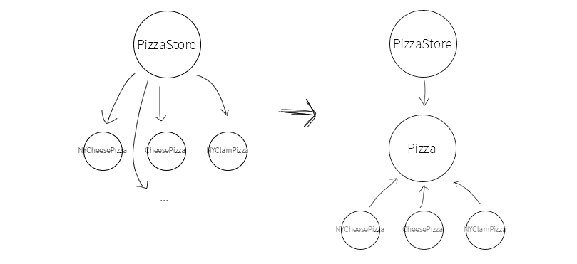 Pizza pizza;if(cheese) {pizza = new CheesePizza();} else if (greek) {pizza = new GreekPizza();} else if (pepperoni) {pizza = new PepperoniPizza();}