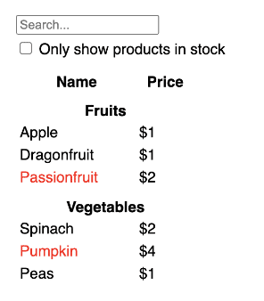 function ProductCategoryRow({ category }) {return (<tr><th colSpan="2">{category}</th></tr>);}function ProductRow({ product }) {const name = product.stocked ? (product.name) : (<span style={{ color: "red" }}>{product.name}</span>);return (<tr><td>{name}</td><td>{product.price}</td></tr>);}function SearchBar() {return (<form><input type="text" placeholder="Search..." /><label><input type="checkbox" /> Only show products in stock</label></form>);}function FilterableProductTable({ products }) {return (<div><SearchBar /><ProductTable products={products} /></div>);}const PRODUCTS = [{ category: "Fruits", price: "$1", stocked: true, name: "Apple" },{ category: "Fruits", price: "$1", stocked: true, name: "Dragonfruit" },{ category: "Fruits", price: "$2", stocked: false, name: "Passionfruit" },{ category: "Vegetables", price: "$2", stocked: true, name: "Spinach" },{ category: "Vegetables", price: "$4", stocked: false, name: "Pumpkin" },{ category: "Vegetables", price: "$1", stocked: true, name: "Peas" },];export default function App() {return <FilterableProductTable products={PRODUCTS} />;}
