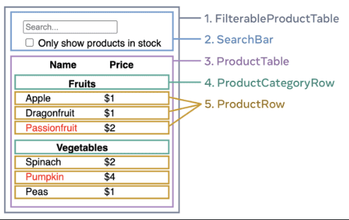 - FilterableProductTable- SearchBar- ProductTable- ProductCategoryRow- ProductRow
